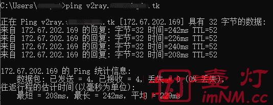 你可以使用 “ping v2ray.mydomain.tk” 命令 或 站长工具IP查询进行检查 Cloudflare CDN 是否添加成功。一旦解析成功后,你就可以放肆地科学上网了(其实,不解析成功照样可以科学上网,只是启用 CDN 后更加安全稳定)。如下图所示: